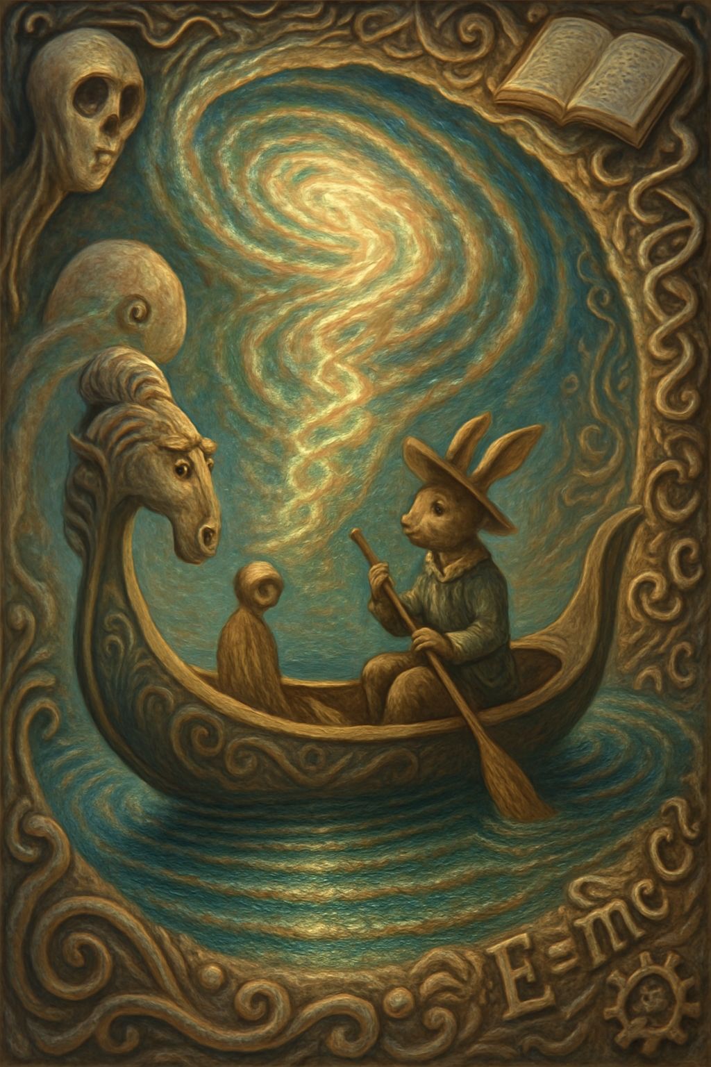 as viewed helically from the artisanal perspective of the lost multihelical lightstream through heat condensation shimmer we're not and I'm not using the hollow manifestation of a creature on the left to create a whimsical tableau on a fantasy anthropomorphic living gondola drifting in a detailed metaphorical ...
