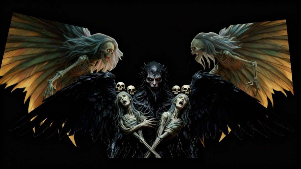 This image depicts a terrifying fusion of a demonic raven with human features and black wings, entwined with two wailing undead figures. Raven skulls adorn its shoulders, creating a nightmarish entity.