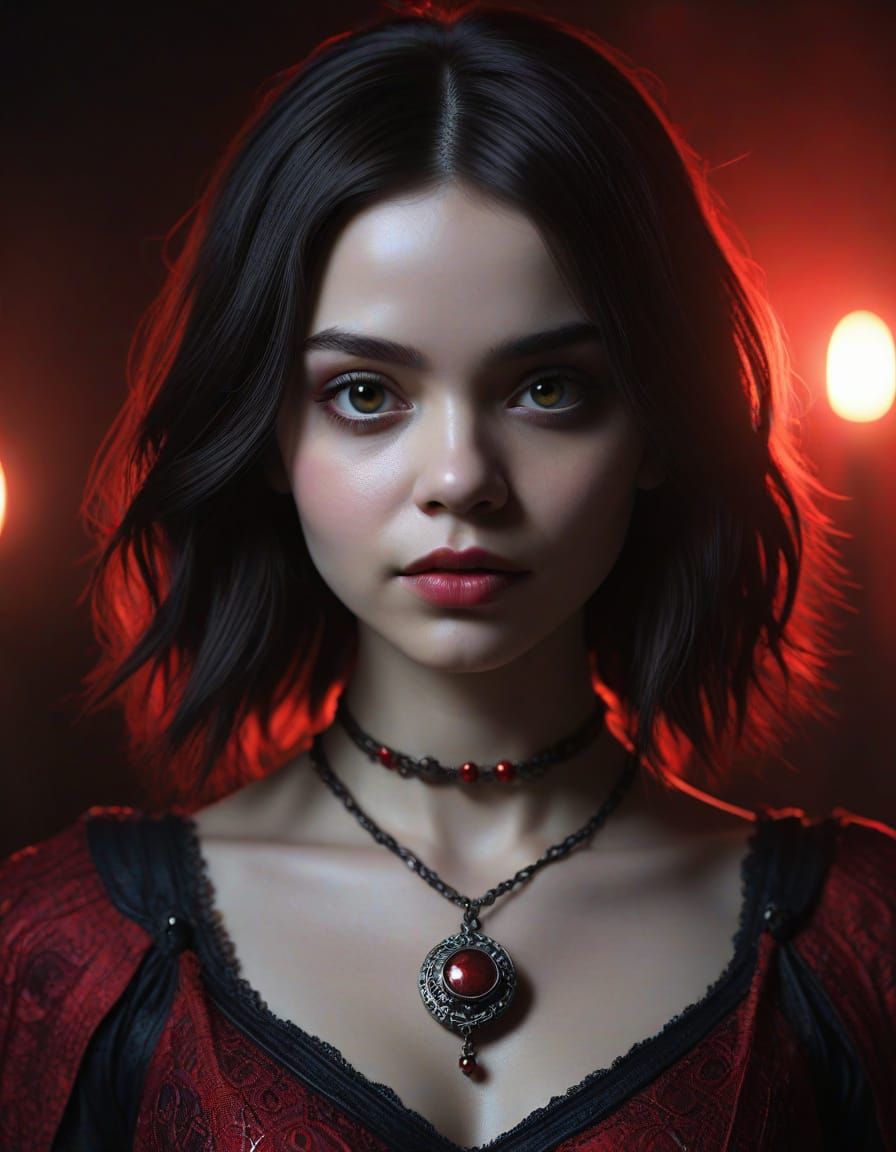 This image shows actress India Eisley as Raven, a superheroine from DC Comics, enhanced with a glowing red amulet. The image is in a dark fantasy art style, featuring vivid colors, detailed textures, and moody lighting.