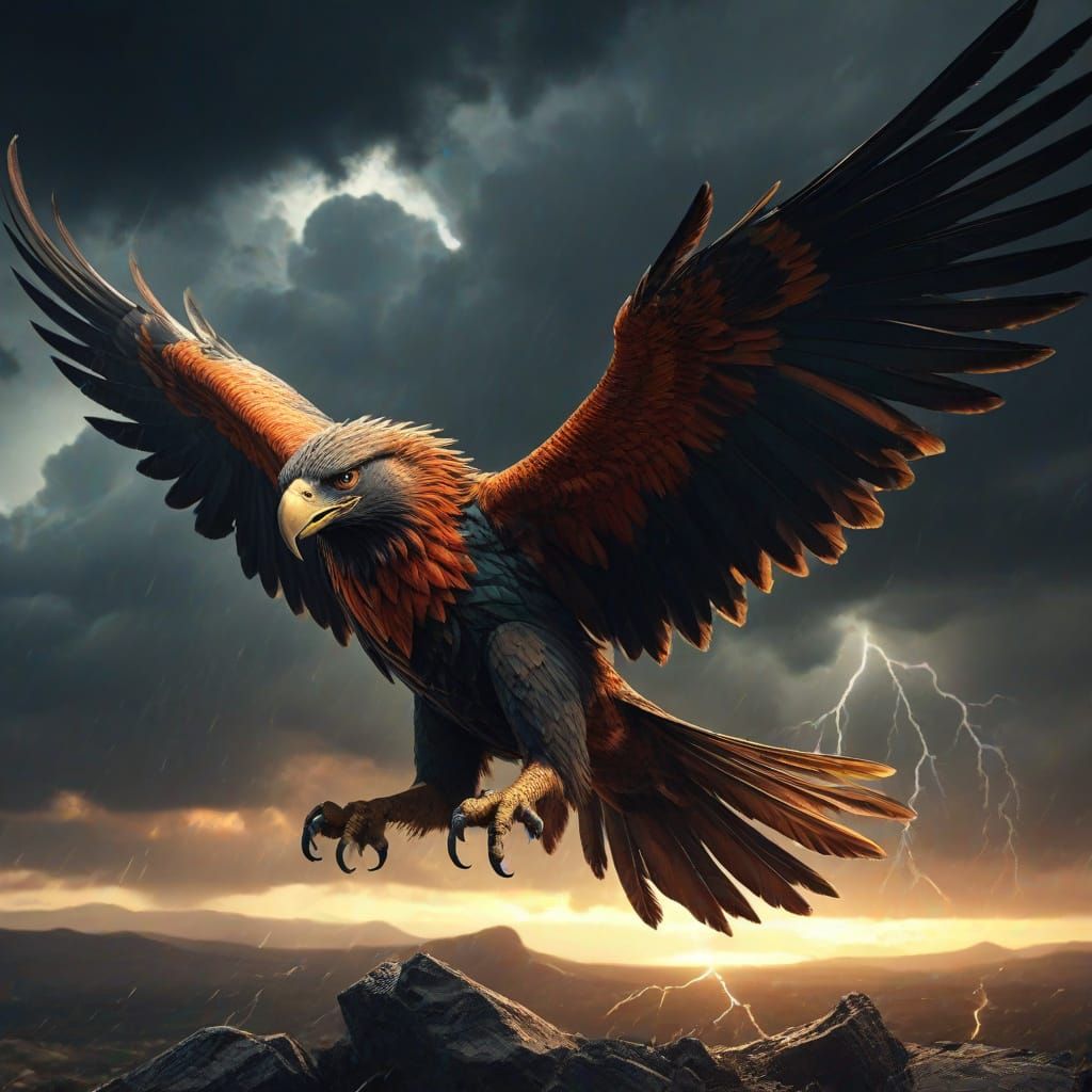 A striking picture of a griffin flying through a storm. Digital art techniques and vivid colors are used to capture the dramatic scene, with its wings spread wide against the wind.