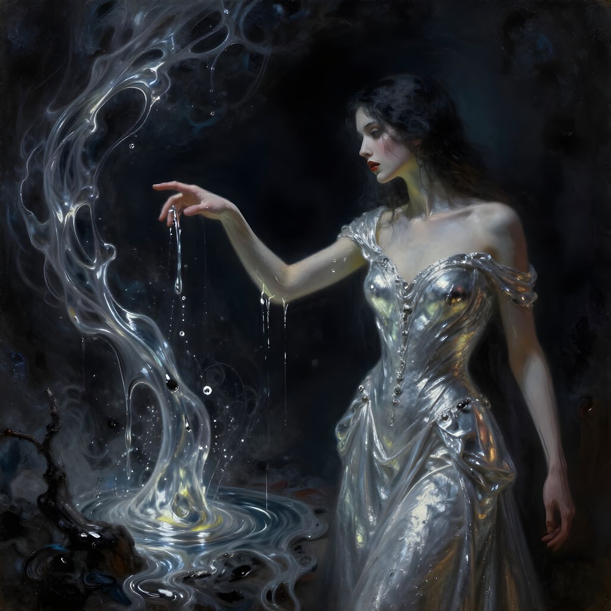 This striking image depicts a woman in a silver gown interacting with a dangerous, flowing mercury-like substance. Rendered in a dark fantasy oil painting style with thick textures and dramatic lighting, it evokes cosmic horror.