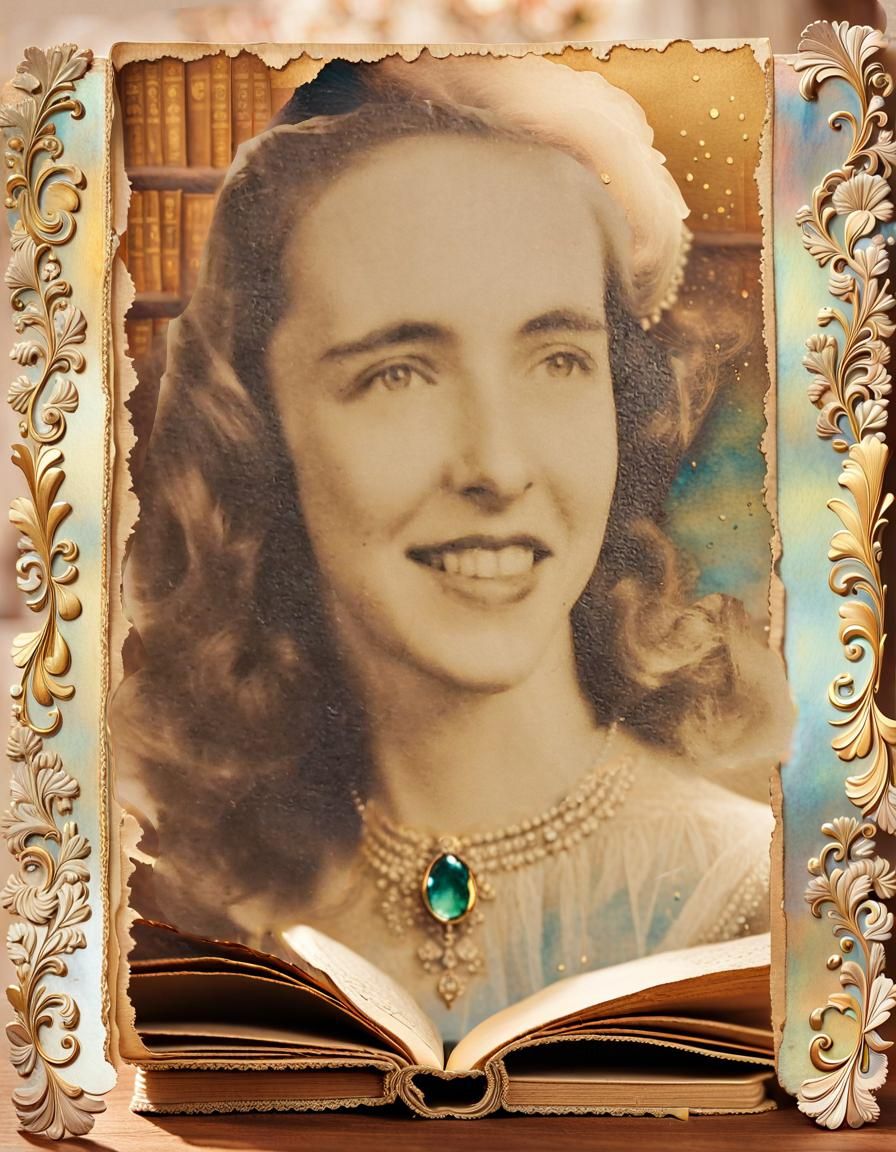 A medium shot of a noblewoman at a desk, surrounded by antique books and paper. The image features a Rococo style with aged textures, iridescent highlights, and a pastel color palette.