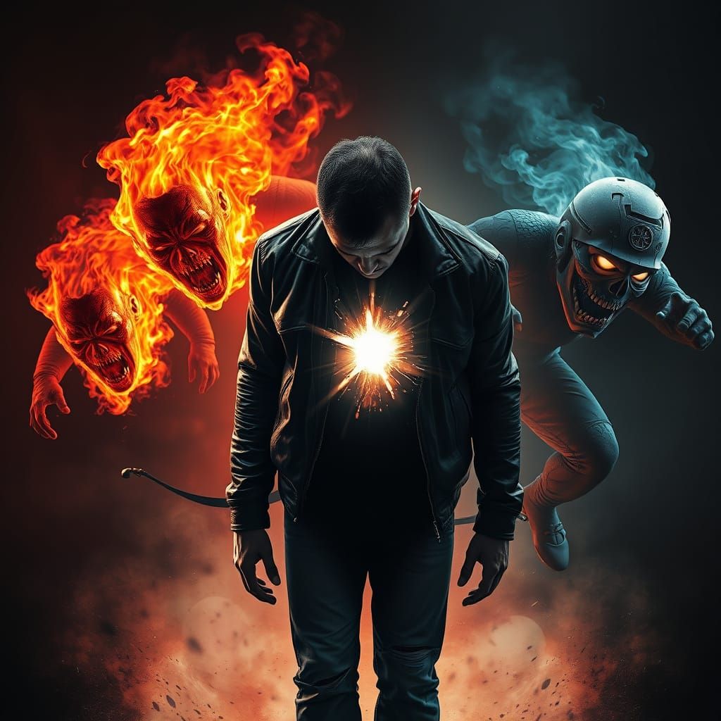 A dramatic image of a man arching backwards as three fiery figures representing PTSD, Depression, and Anxiety attack him. The scene is rendered with dark, gritty realism in a cyberpunk aesthetic.