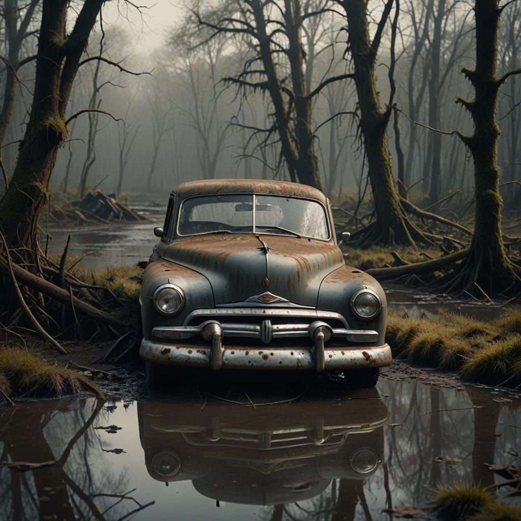 This digital matte painting captures a rusty 1950s car submerged in a desolate, foggy swamp. It evokes a haunting beauty with dramatic atmospheric lighting.
