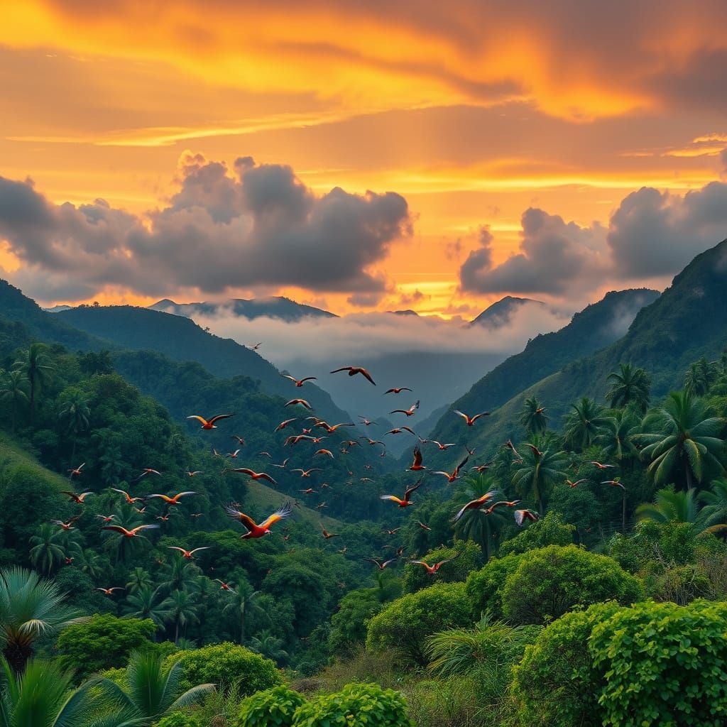 This image shows a landscaper walking through a tropical valley at sunset, accompanied by a flock of colorful birds. The scene is rendered with hyperrealistic detail and vibrant colors, like a cinematic photograph.