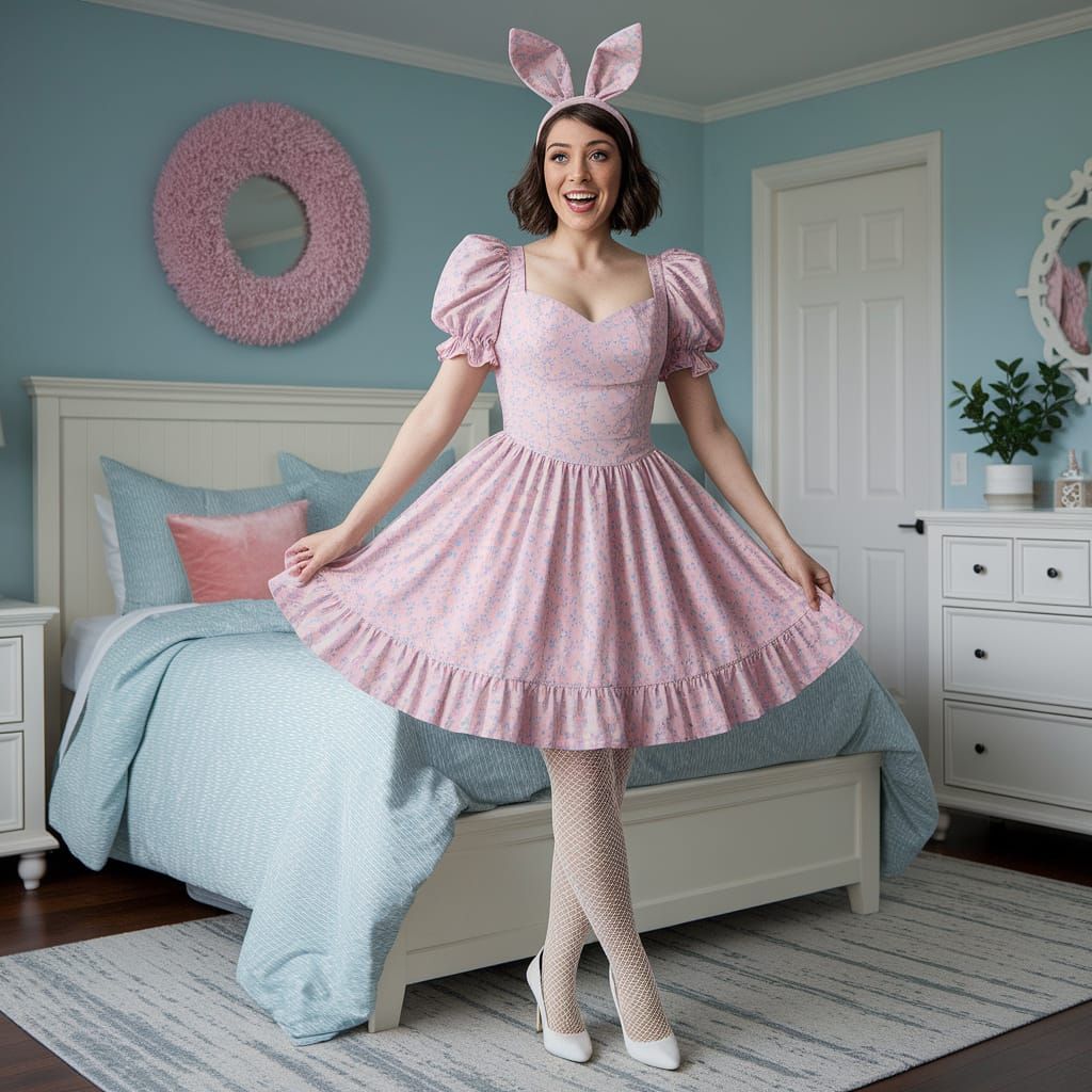 This image depicts a young man with delicate features, short hair, and visible leg hair, surprised while crossdressing in a bedroom. He is wearing a frilly dress, puffy sleeves, and high heels.