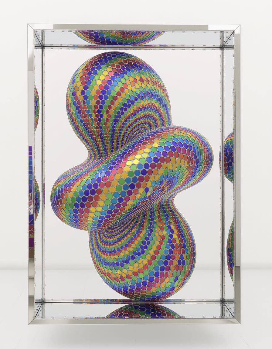 This artwork features a vibrant abstract mixed media composition with billowy forms. The colour palette is prismatic, with rainbow hues and stainless steel textures creating a dynamic, polished visual.