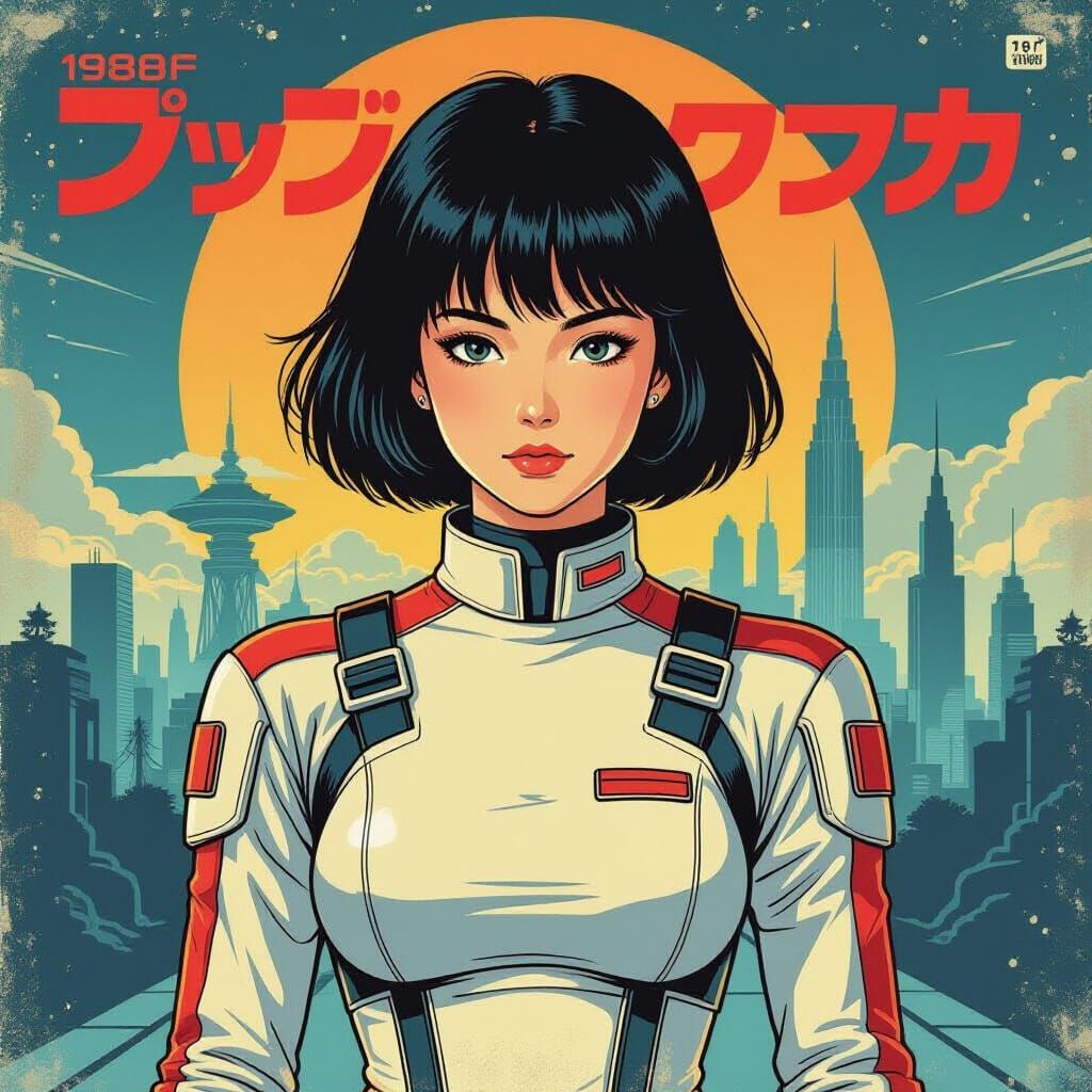 This image depicts a retro-style VHS cover illustration for a science fiction movie. It features a Japanese girl in a futuristic astronaut suit, with a distant cityscape backdrop in a vintage 1980s aesthetic.