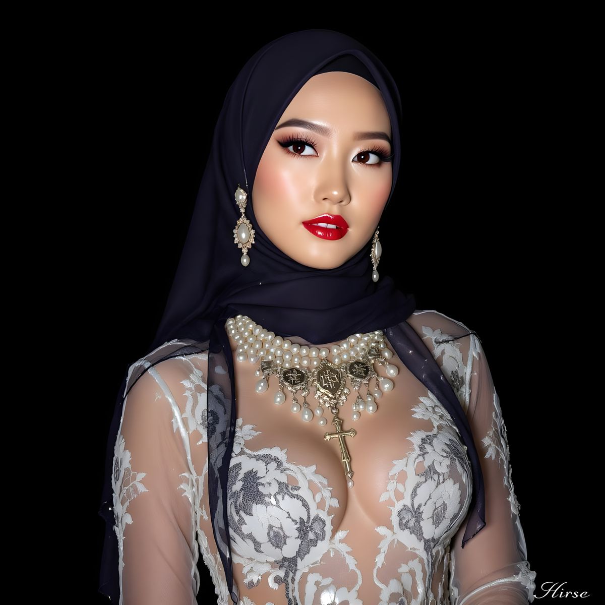 This image shows an Asian woman in an elegant hijab and sheer dress. She is adorned with jewelry and rendered in a style reminiscent of art nouveau with metallic sheen.