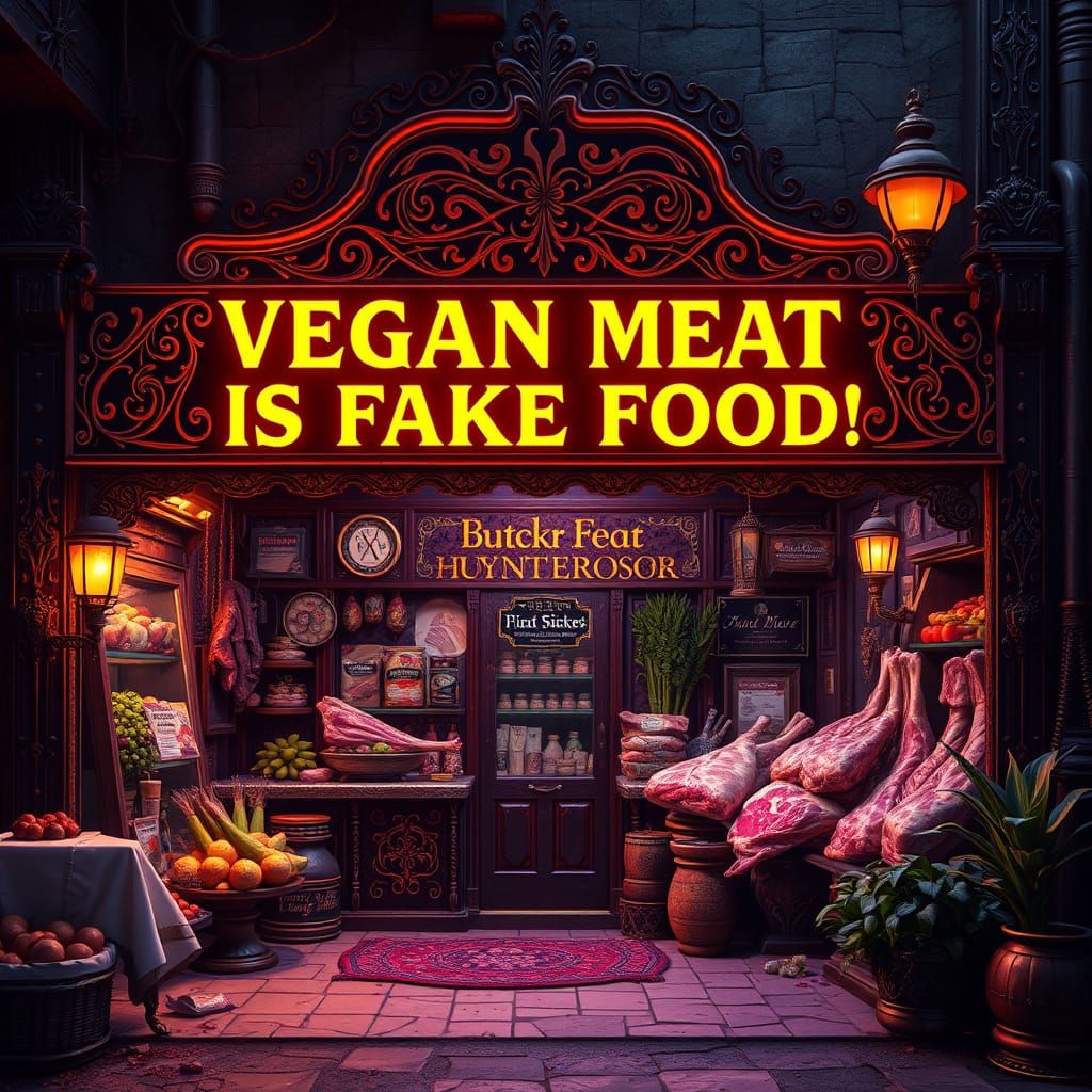 This haunting illustration depicts a mystical, decrepit butcher shop showcasing vegan 'meat' products, with a bold warning emblazoned across the facade in ornate, golden lettering. The scene is illuminated by dynamic, volumetric lighting, with intricate patterns and hyper-realistic textures, rendered in ...
