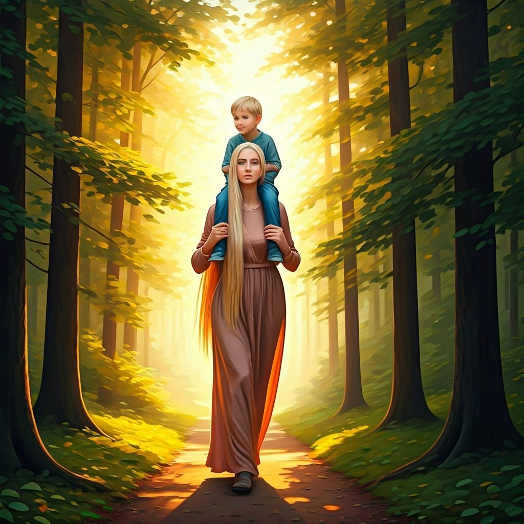 This image shows a tall woman with long blonde hair carrying a boy on her shoulders through a sun-dappled forest. Rendered as an impressionistic oil painting with visible brushstrokes and a vibrant color palette.