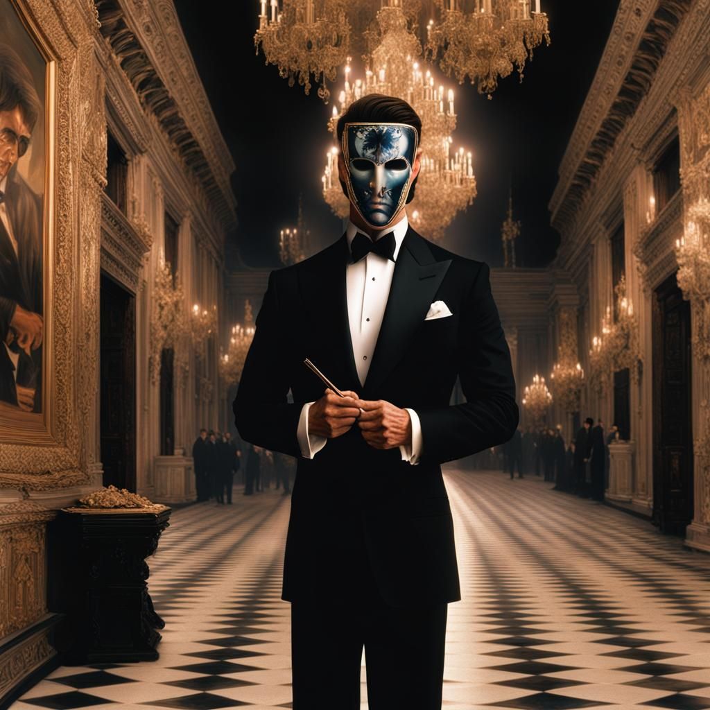A dramatic digital painting of a terrified man in a tuxedo holding a Venetian mask. The cinematic image is meticulously detailed and atmospheric, reminiscent of digital matte paintings.