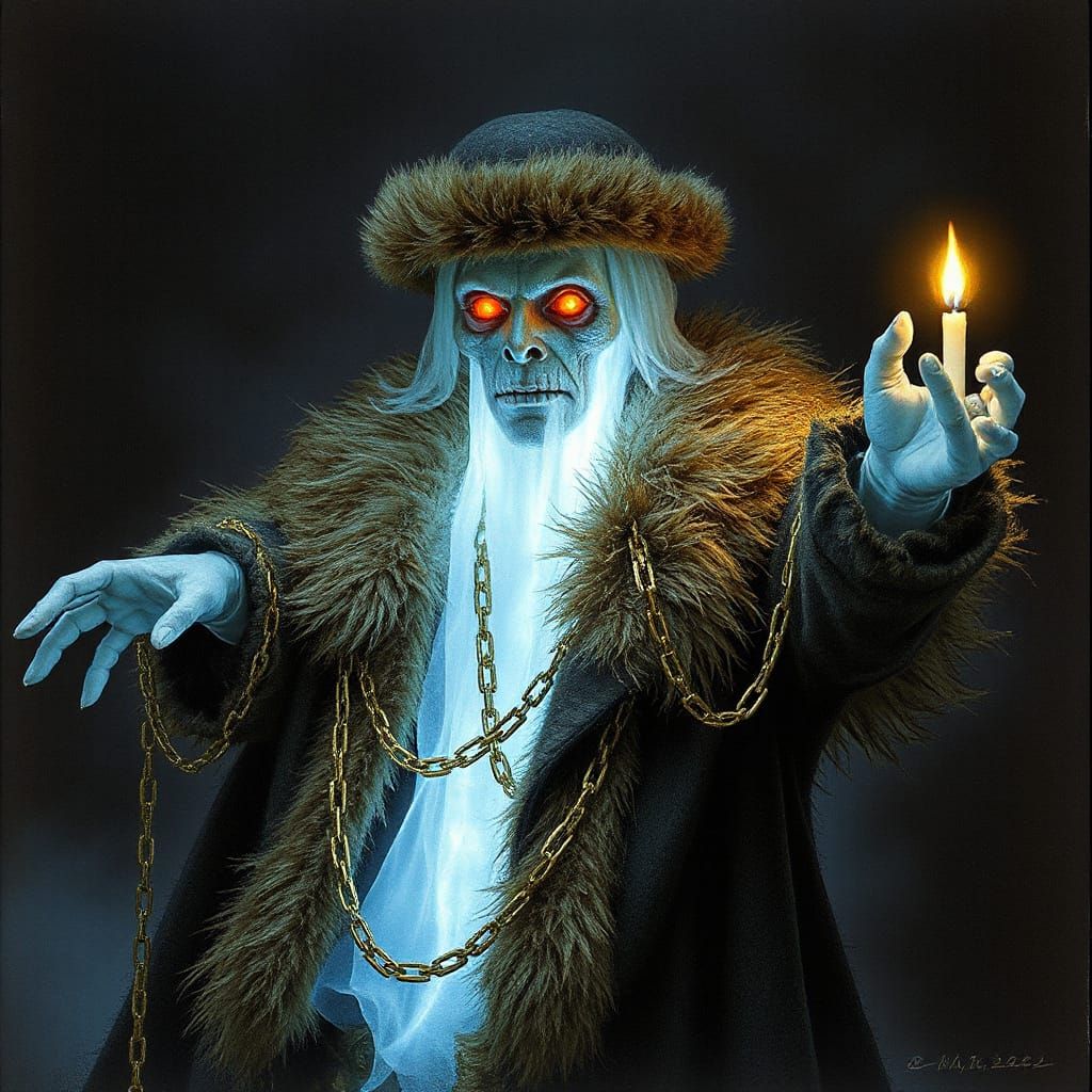 This image depicts the Ghost of Christmas Present from Dickens' A Christmas Carol, rendered with ethereal lighting and glowing eyes. The spectral figure wears 19th-century attire and carries chains, in a dark, surreal etching style.