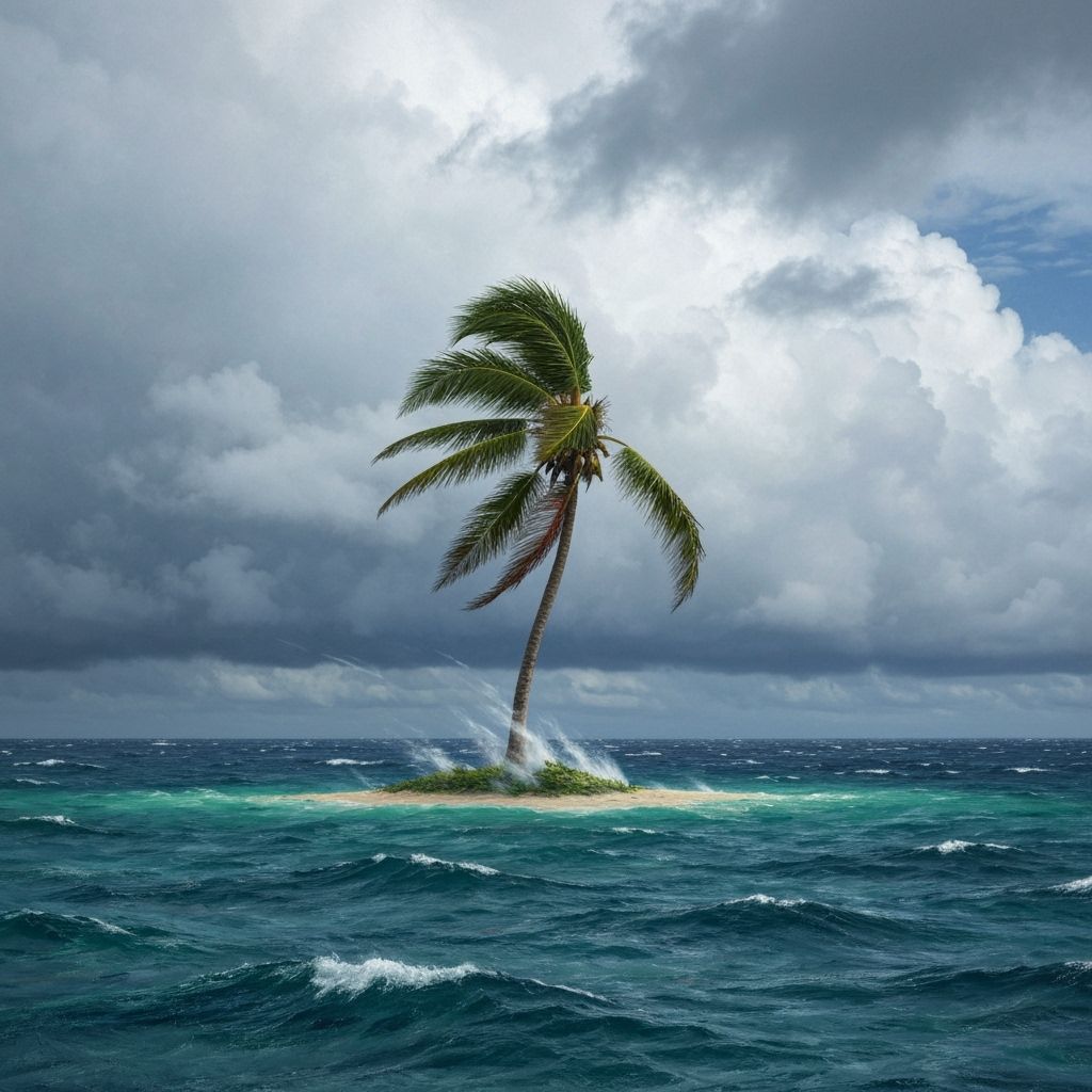 This image captures a surrealist, lonely palm tree struggling in a fierce hurricane at sea. It features vibrant colors and textured paint, evoking a sense of movement and light.