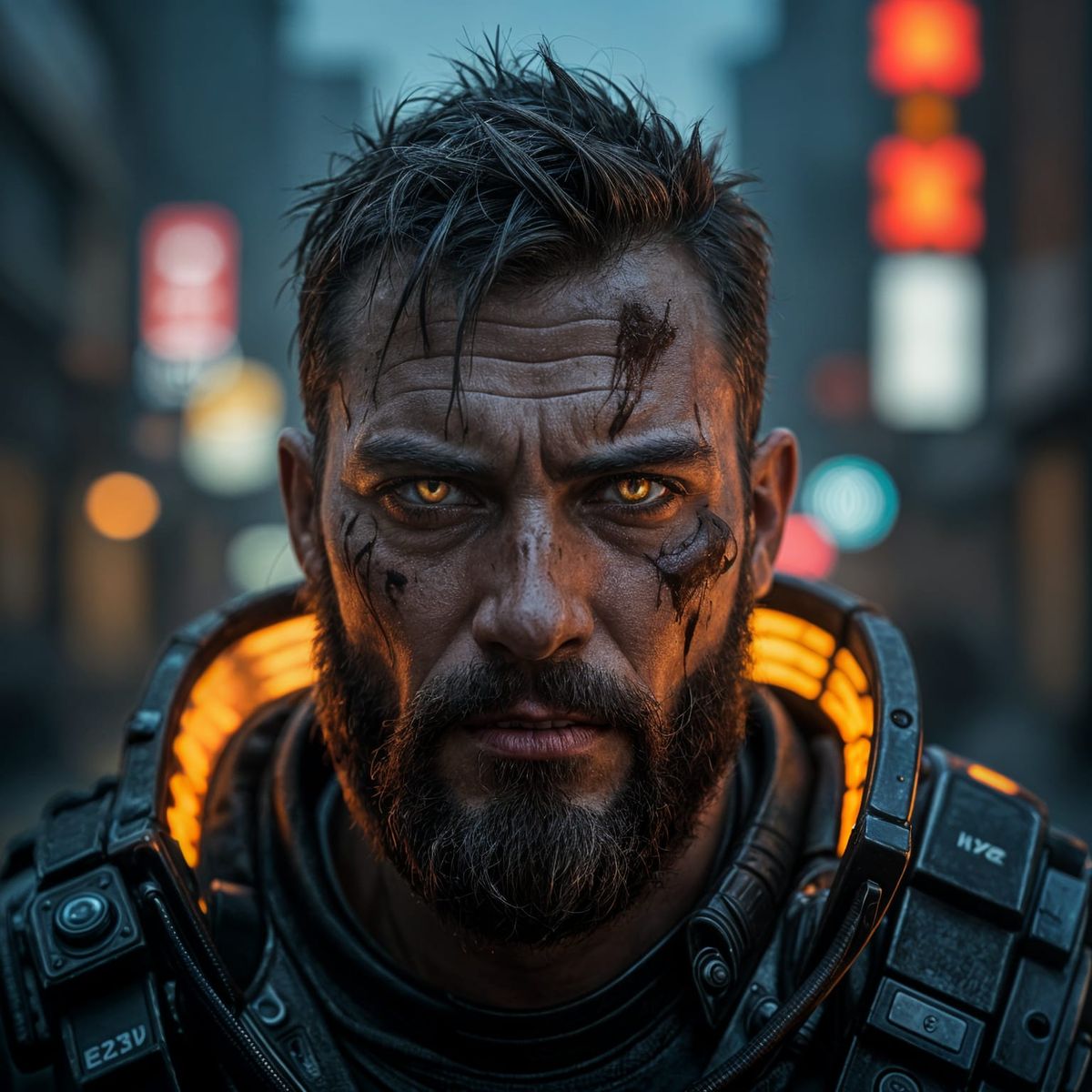 A photorealistic close-up of a battle-hardened cyberpunk grappler at night, face streaked with grime and oil, cybernetic eyes glowing with HUD displays. His massive mechanical arms crackle with energy.