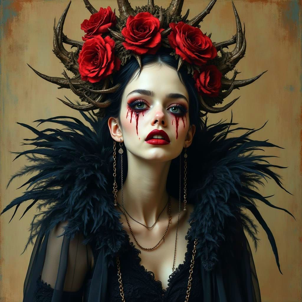 A hauntingly beautiful woman stands in a dimly lit chamber, her alabaster skin adorned with intricate veins and her dark red lips a stark contrast to her empty eye sockets. A baroque gothic crown and tattered black gown add to her eerie yet majestic presence.