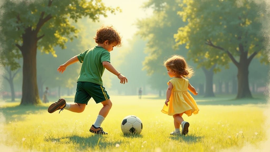 A heartwarming scene of childhood emotions unfolds as a boy plays soccer while a girl walks away, saddened. The artwork evokes a nostalgic, painterly feel.