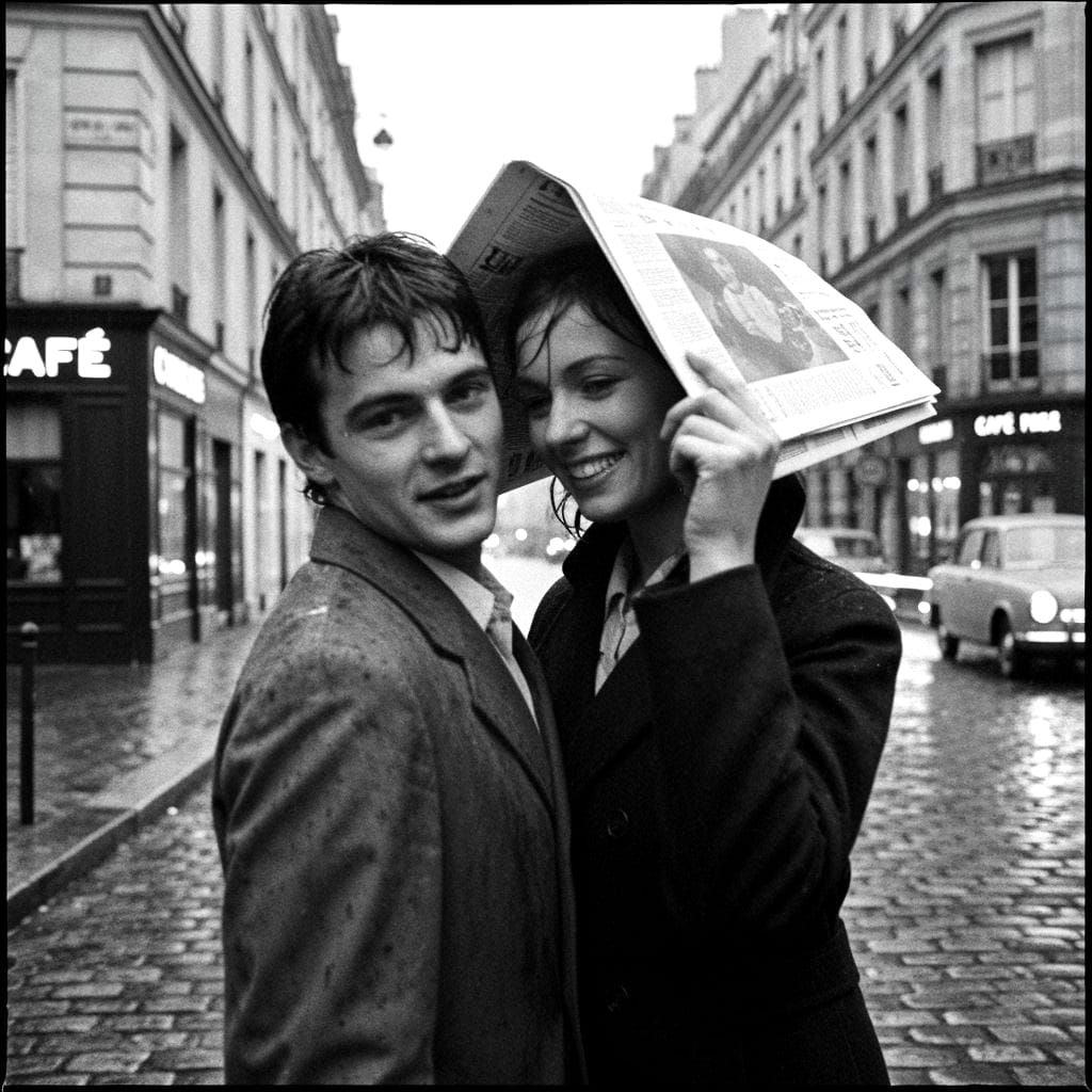 A powerful 1960s-style black-and-white street photograph: two young lovers caught mid-embrace on a rainy Paris backstreet, their faces partially blurred by motion and emotion. The man’s coat is soaked; the woman clutches a folded newspaper over her head. Cobblestones reflect the glow of a single café ...