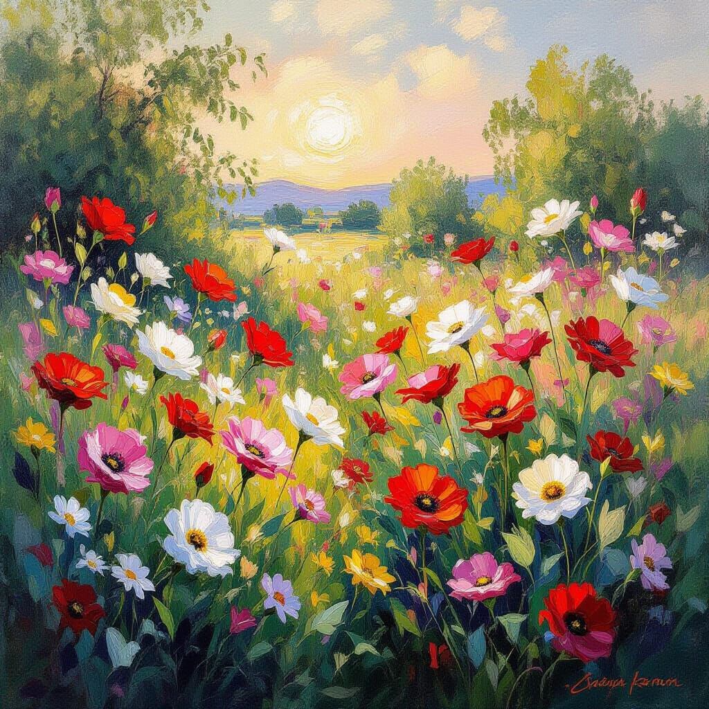This image showcases vibrant, dancing flowers in a lush garden at sunset, captured in an impressionistic oil painting style with energetic brushstrokes and vivid colors, emphasizing light and movement.