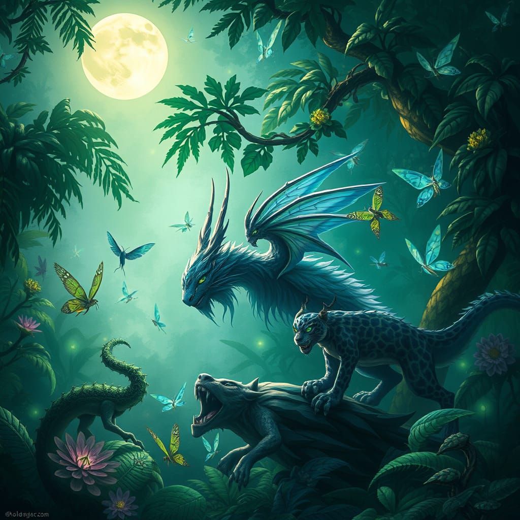 A vibrant image of mythical creatures congregating in a bioluminescent jungle. The scene is rich with glowing flora, ethereal mist, and fantastical wildlife, rendered with layered textures and magical, dreamlike colors.
