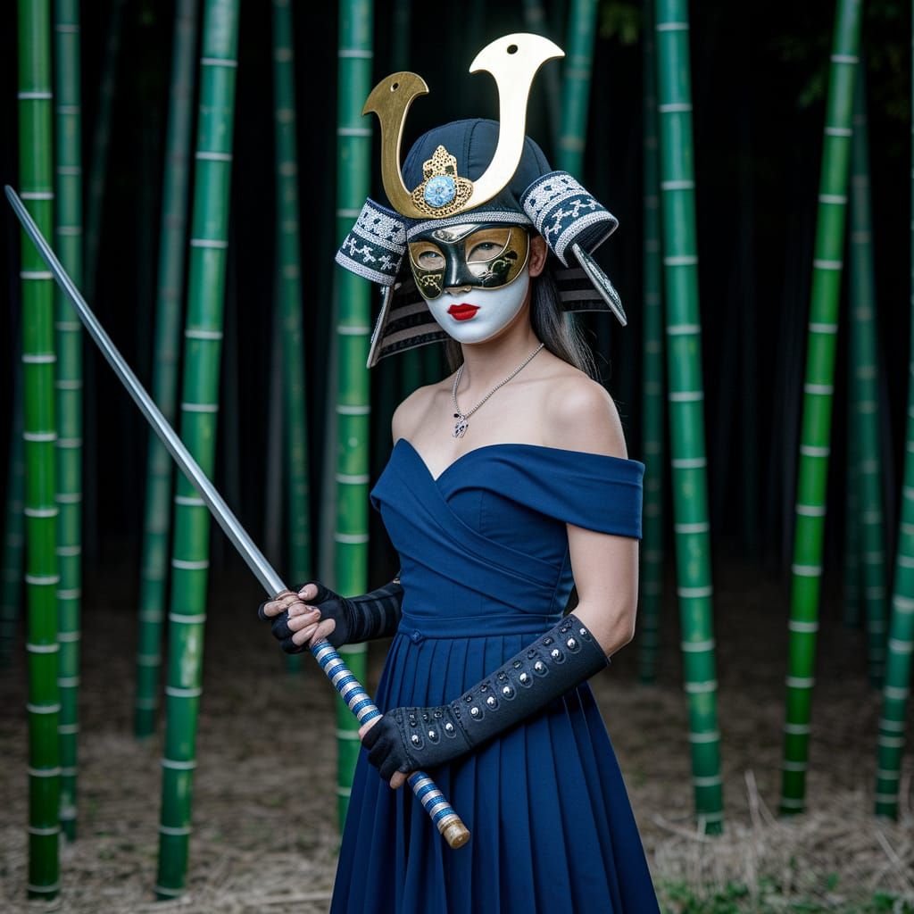 BEAUTIFUL BLACK FEMALE SAMURAI IN A VENETIAN MASK DRESSED IN A NAVY-BLUE EVENING DRESS IN A BAMBOO FOREST IN THE NIGHT.