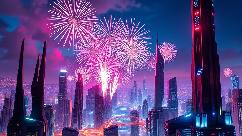 A vibrant display of fireworks over a futuristic cityscape. This image captures a dazzling spectacle of light and color reflecting off metallic skyscrapers, creating a scene reminiscent of futuristic concept art.