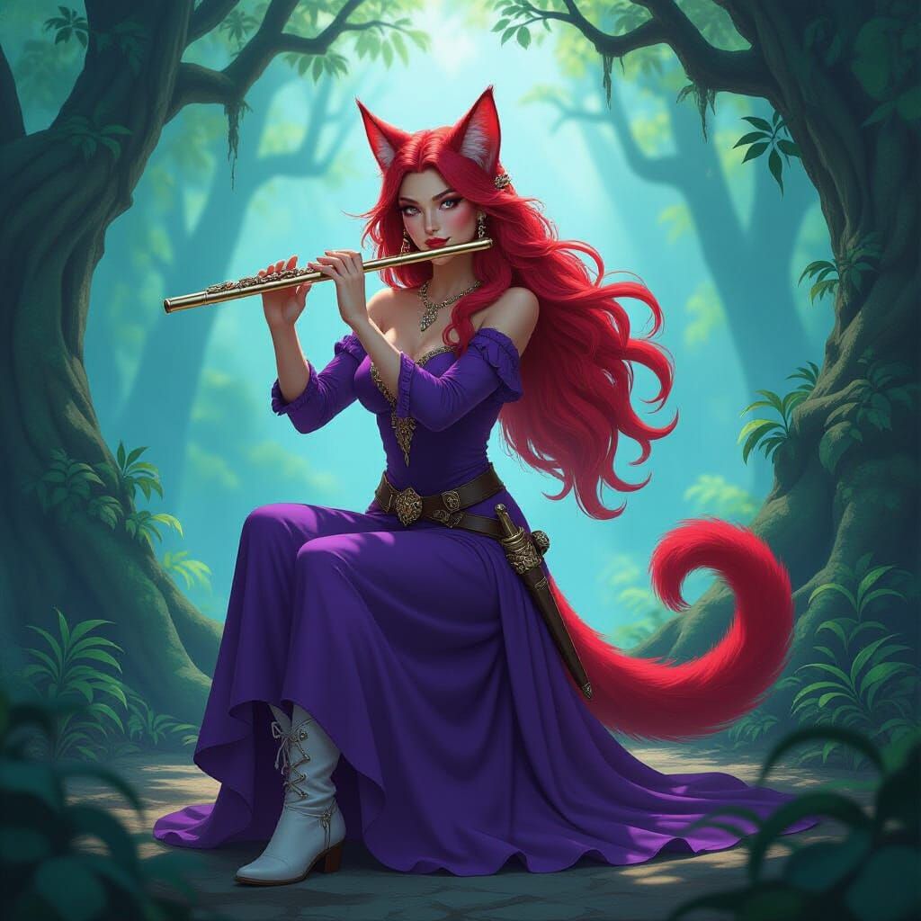 A tabaxi musician in a flowing purple dress plays a flute in a sun-dappled mystical forest. Rendered in a vibrant fantasy concept art style with dramatic lighting.