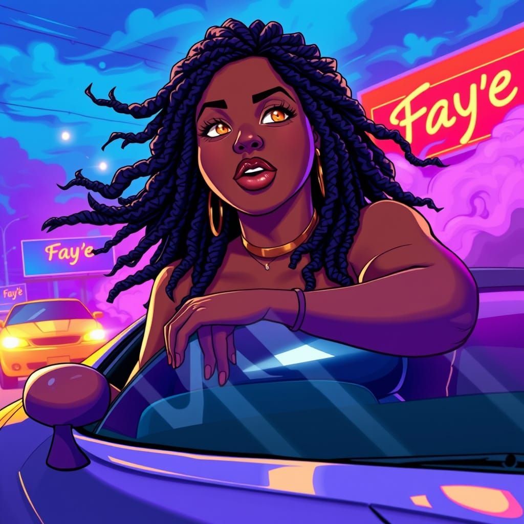 This image showcases a vibrant anime scene of a confident, plus-size African-American woman with dreadlocks leaning from her classic Firebird during a street race. Features dynamic motion lines and vivid colors.