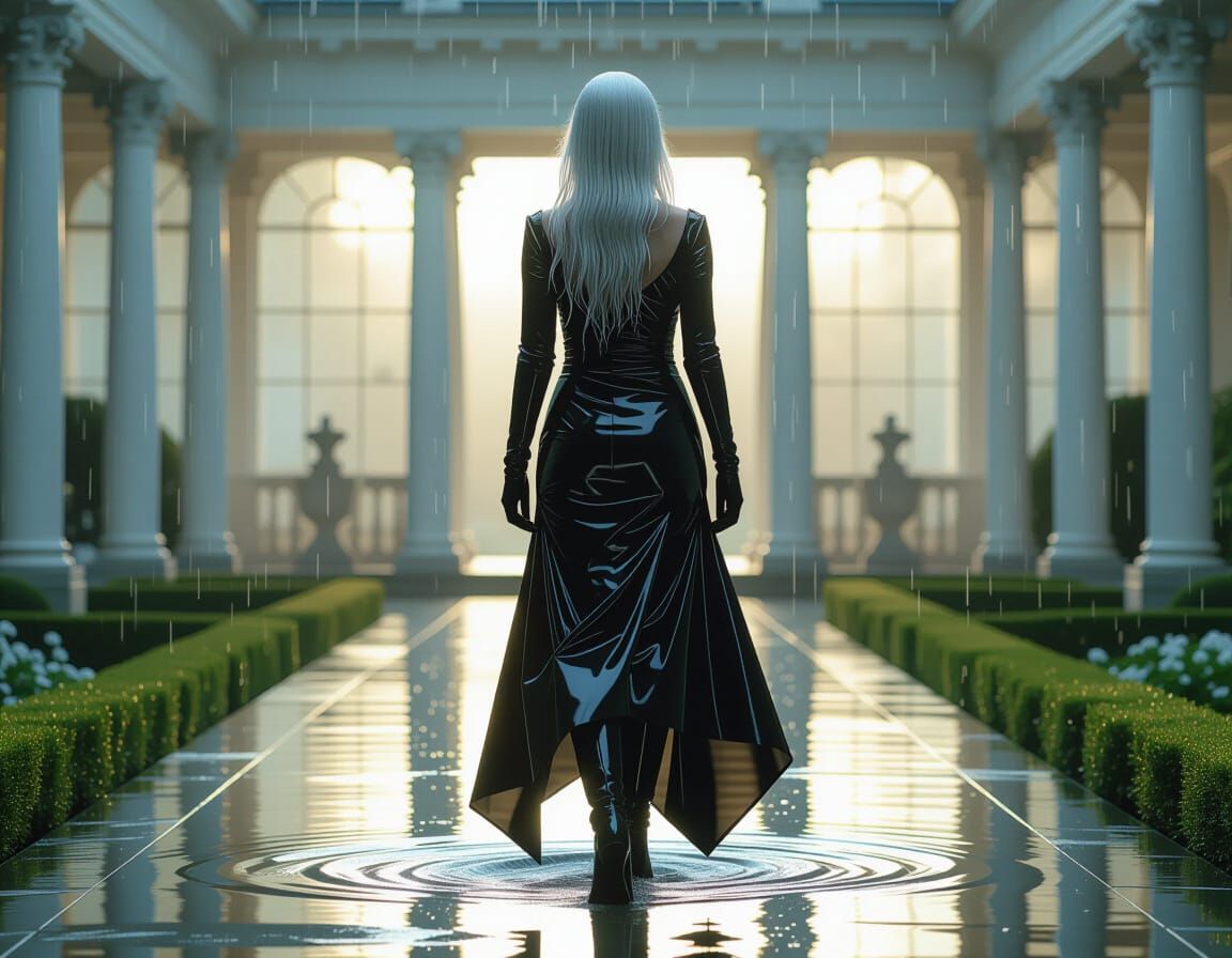 This image shows a woman with flowing silver hair walking through a rain-swept palace garden. She is wearing a sculptural, floor-length black latex gown with reflective knee-high boots in a cinematic style.