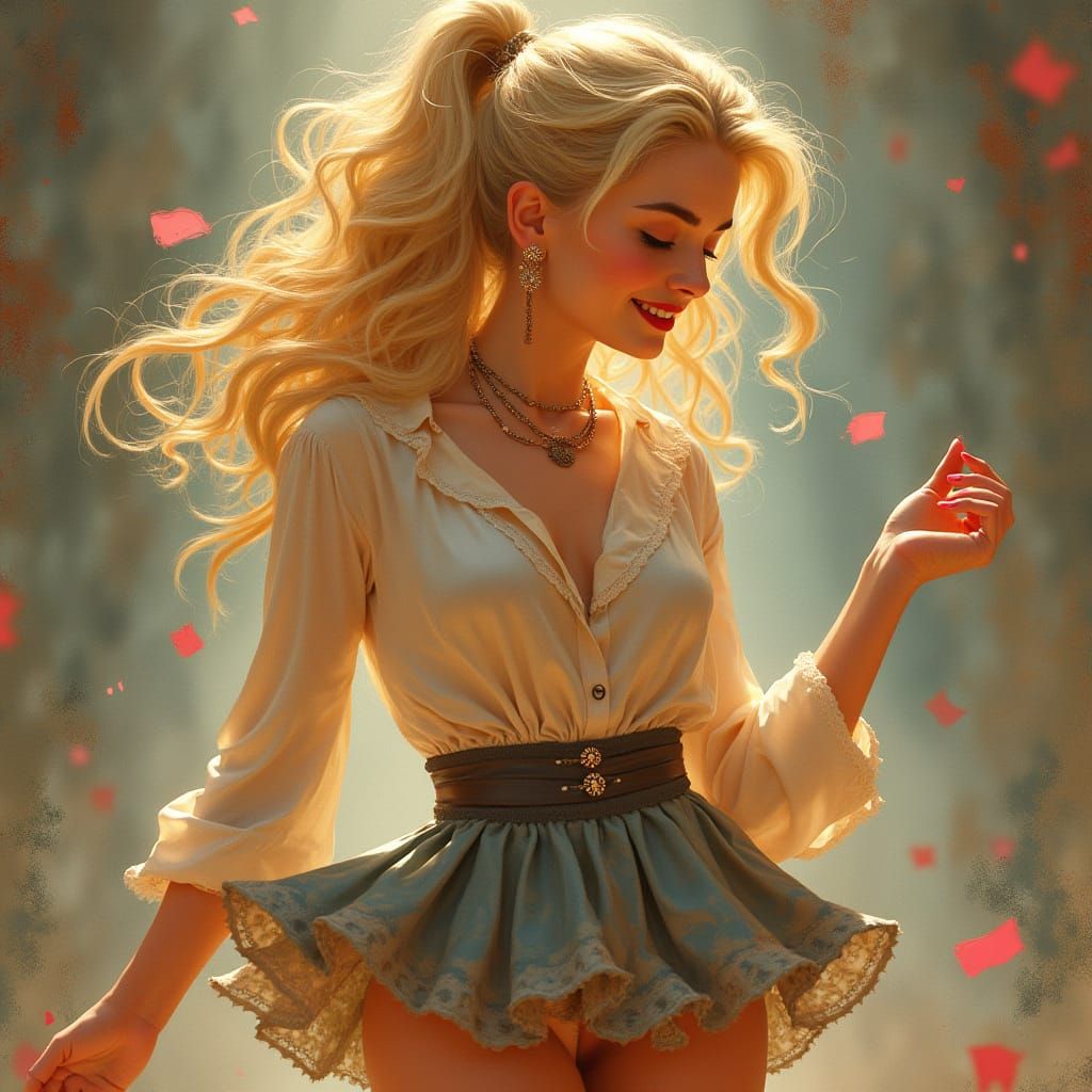 A digital painting of a blonde woman smiling, wearing a mini skirt and blouse. The image features intricate textures and vibrant colors in the style of Art Nouveau.