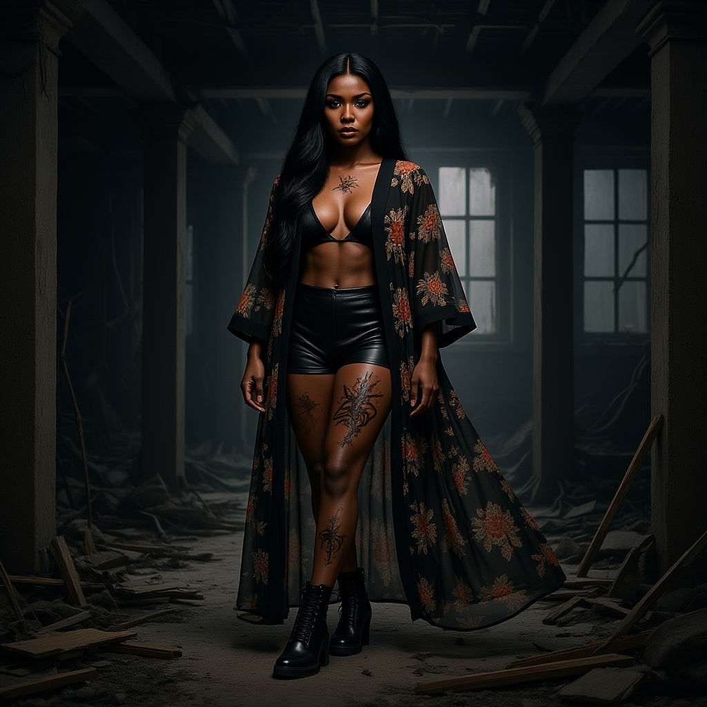 A striking picture of a powerful African woman in a destroyed room. This image evokes a dark, dystopian atmosphere with intricate textures and atmospheric lighting, reminiscent of cinematic horror.