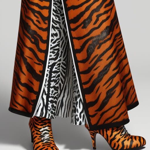 A highly detailed fashion illustration of a woman in a white tiger print dress, carrying an orange tiger print purse and wearing matching boots. Features intricate fur, vibrant stripes, and dramatic studio lighting.