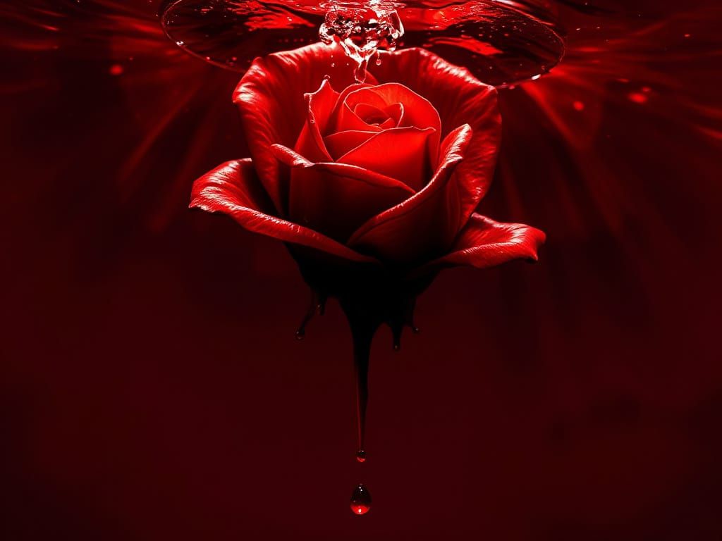 This image shows a dark blood rose encased in a transparent water dome, with ink-like drips and gothic lighting. It evokes a surreal, Bosch-inspired atmosphere with intricate digital art details.