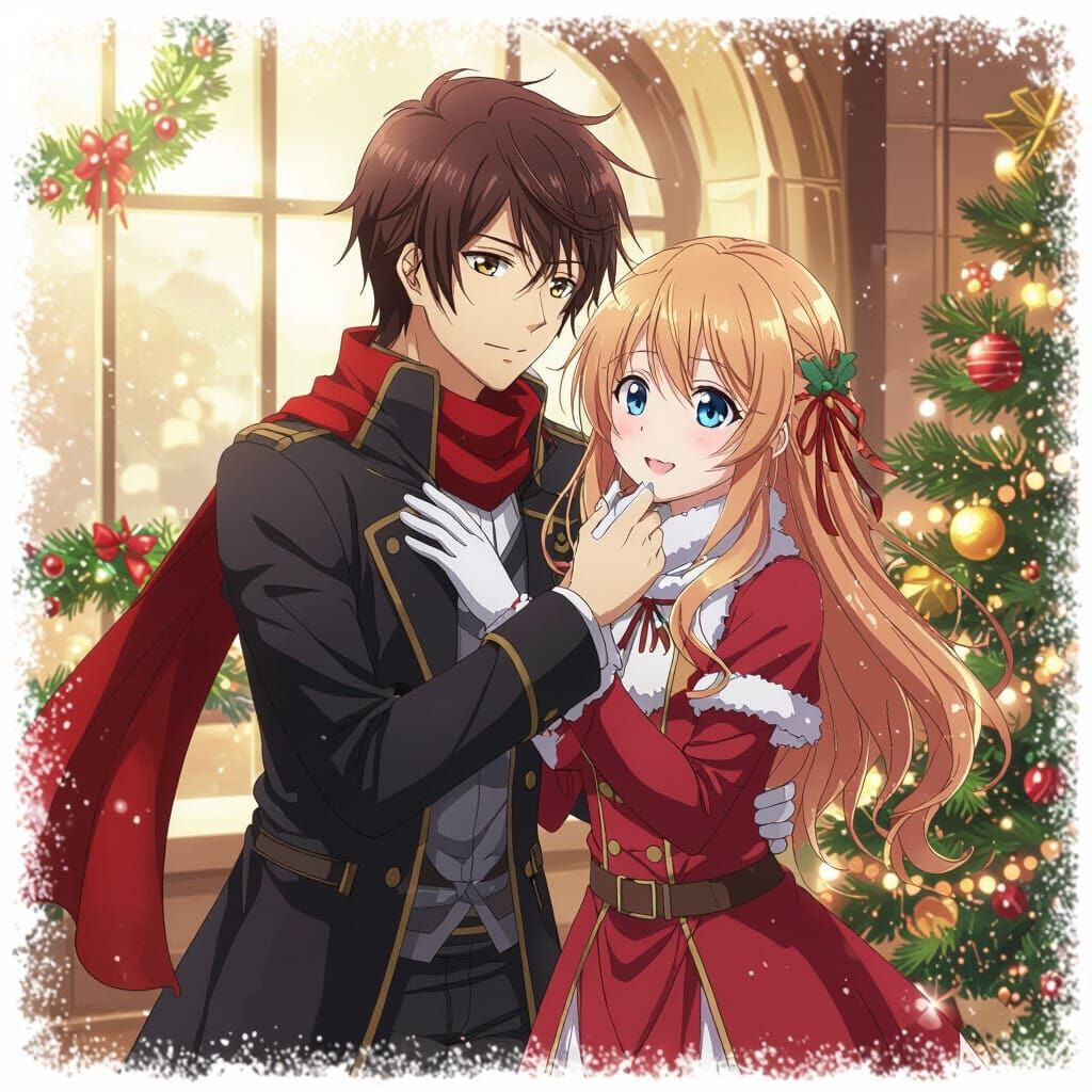 This image depicts a romantic anime scene under a sprig of mistletoe, capturing a tender kiss in a charming animation style.
