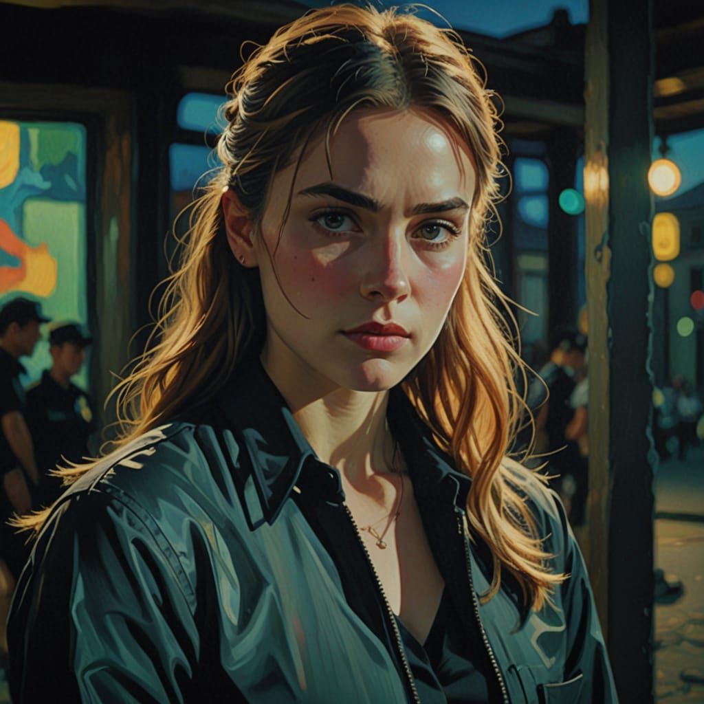 This image captures a proud soldier girl in a striking uniform, rendered with bold brushstrokes and vibrant colors reminiscent of Fauvist expressionism. Golden hour lighting enhances the dramatic atmosphere.