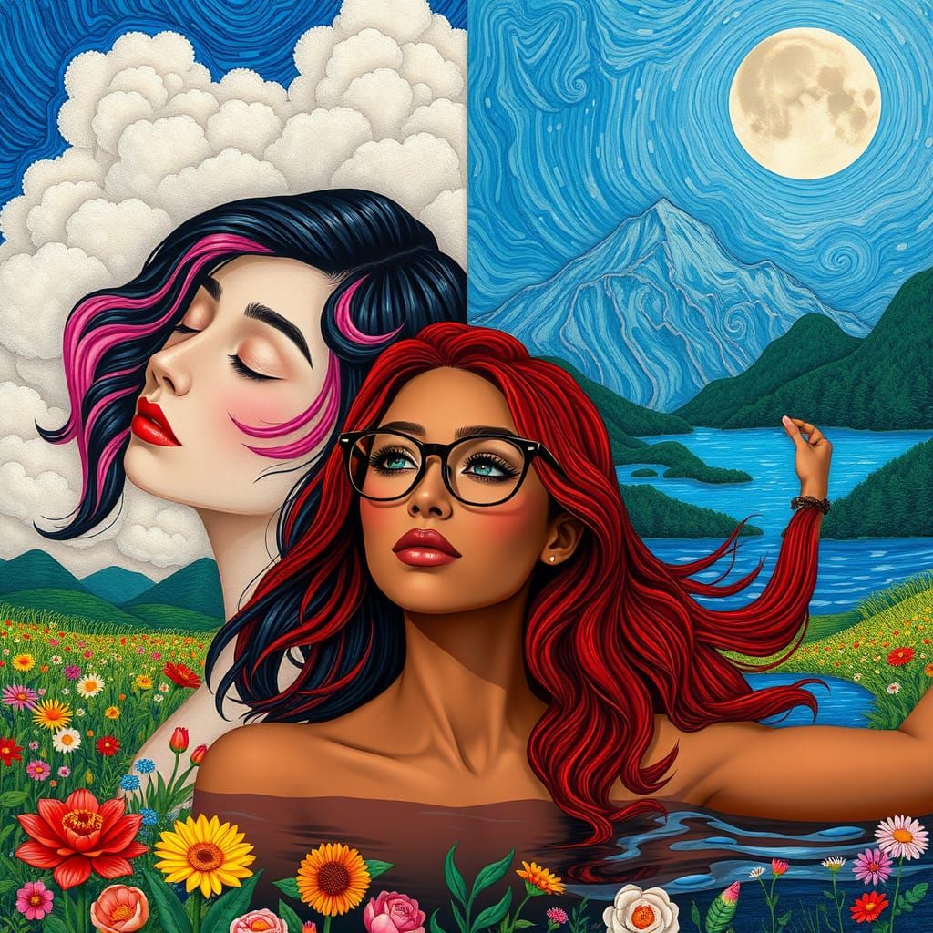 A vibrant and whimsical scene of women with colorful hair in a dreamlike landscape. The image evokes fantasy and reality in a style reminiscent of fabric embroidery. The color palette is inspired by Van Gogh.
