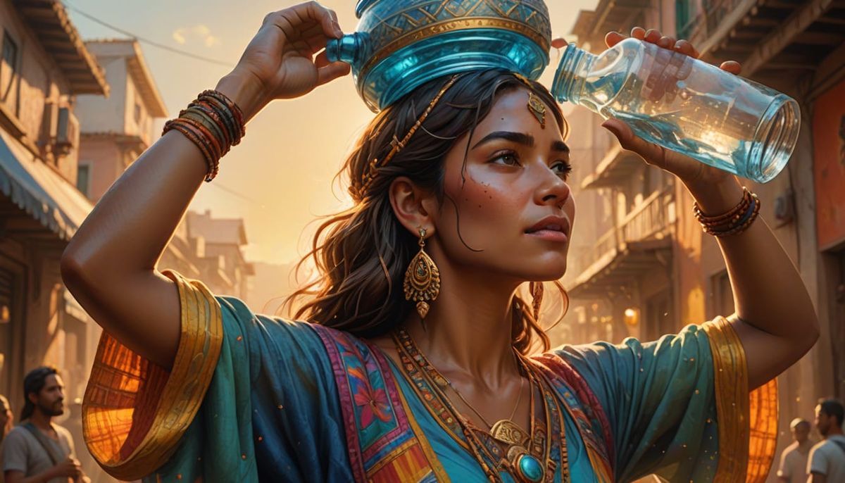 This image shows a young woman carrying a water jug on her head in a hyperrealistic style. The artwork features vibrant colors, golden light and intricate details in 8k resolution.