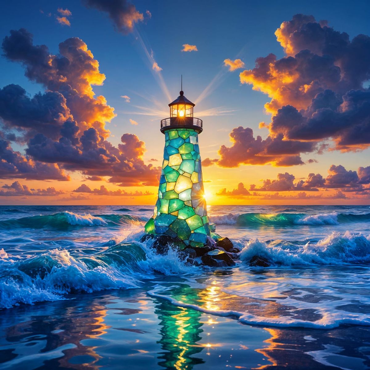 This image depicts a vast seascape and lighthouse made of luminous sea glass, with waves and an epic sunset sky in vibrant, glowing colors. Rendered in a painterly, cinematic style.