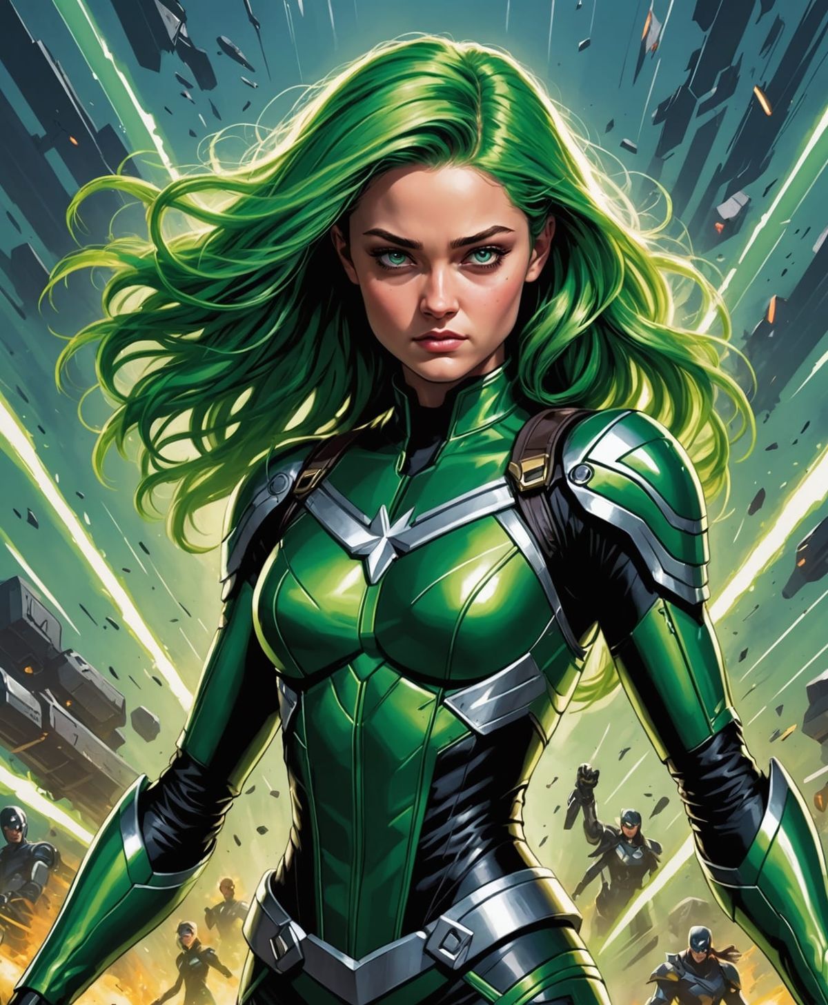 This image shows a portrait of a green-haired woman who appears to have magnetic powers. She is depicted as an athletic and well-proportioned cinematic superhero.