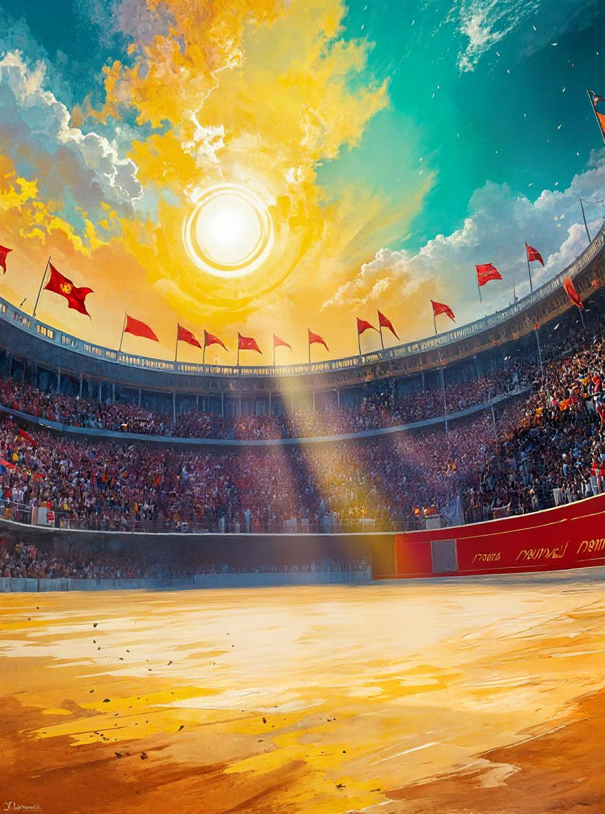 This image shows the famous running of the bulls during a 1920s fiesta in Pamplona, Spain. A bull charges in a crowded bullfighting arena as a matador waves a red cape as the sun sets in a vintage aesthetic.