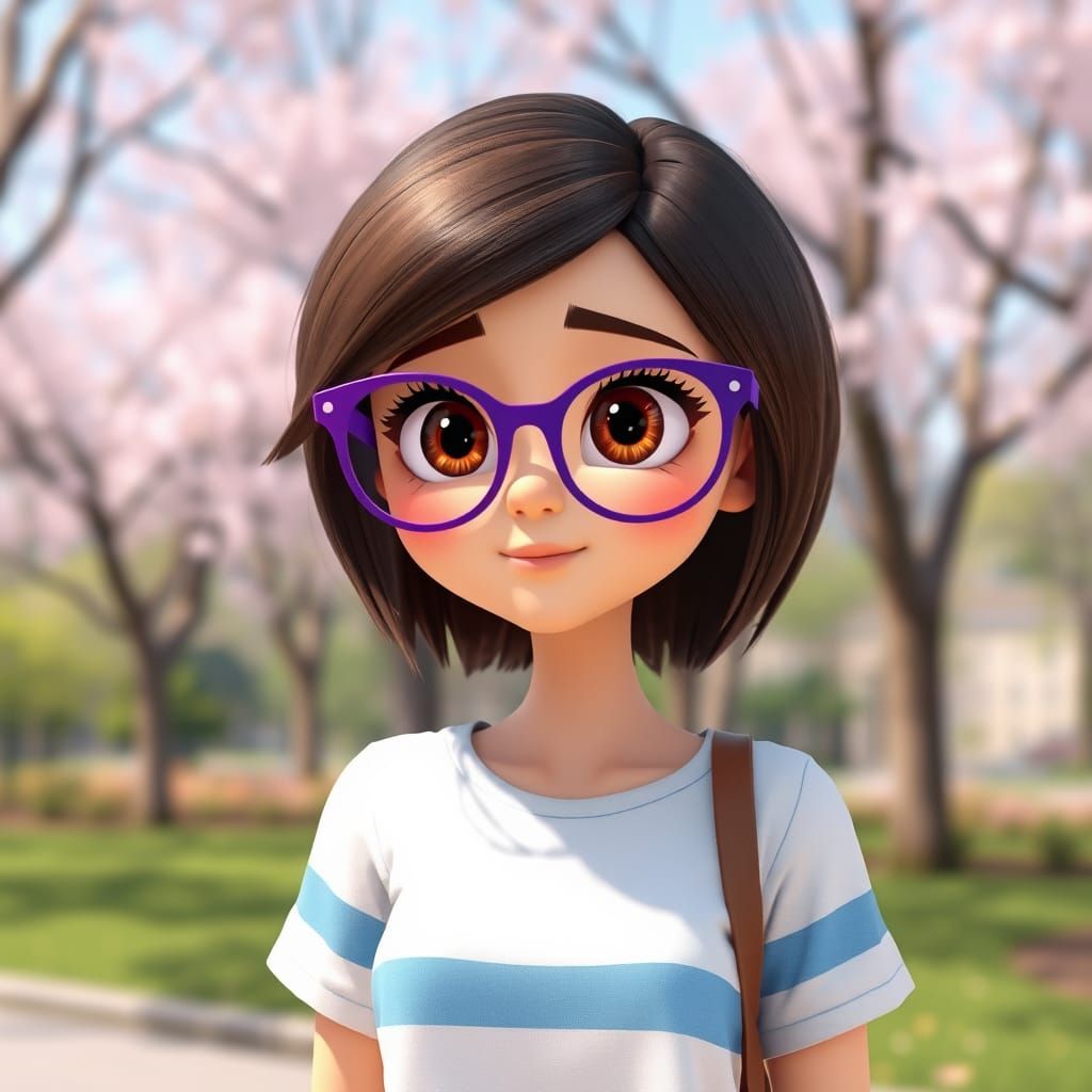 This animated image depicts a young woman with brown eyes and purple glasses, wearing a white t-shirt with blue stripes, in a serene spring park setting.