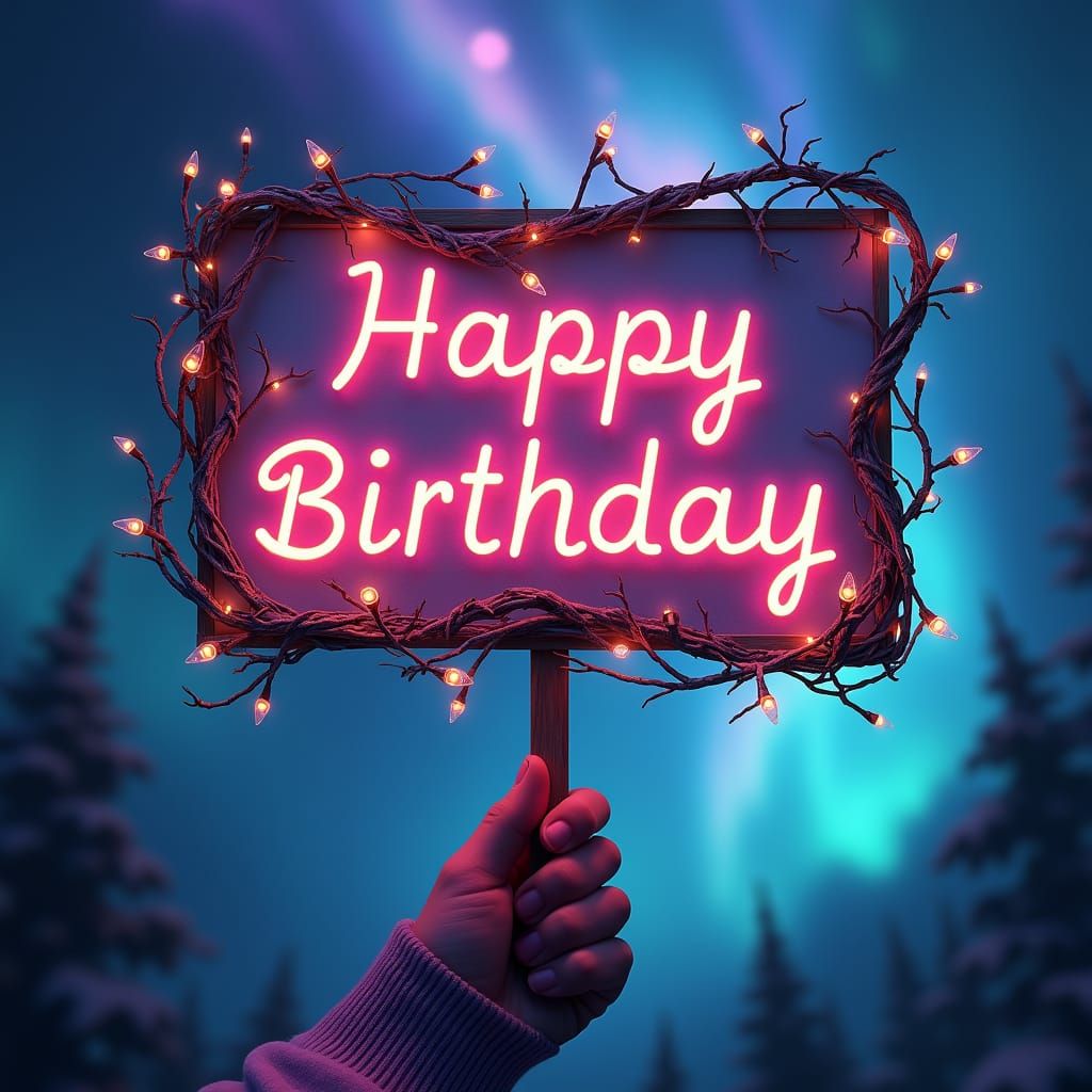 A luminous birthday sign made of glowing vines held in a child's hand. The background features swirling colors reminiscent of the aurora borealis, rendered as digital art with intricate details.