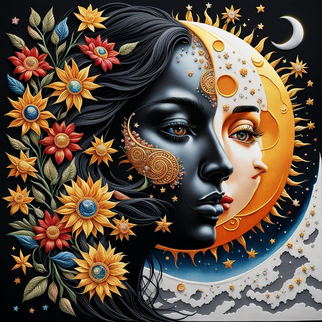 Painting, face in the sun, josepine wall. black background Sun And Moon half women face from the side, in the moon decorated with Flowers along the face Landscape Full Artificial Diamond stars Embroidery Cross Stitch, perfect photo quality colors, details, masterpiece,