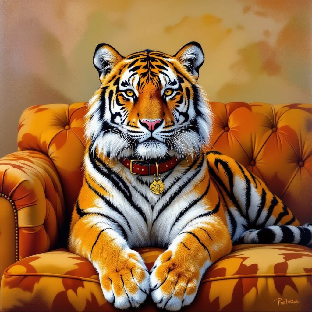 This image shows a vibrant orange and black tiger wearing a brown leather collar, sitting on a striped yellow and black couch. The illustration evokes naturalistic wildlife art.