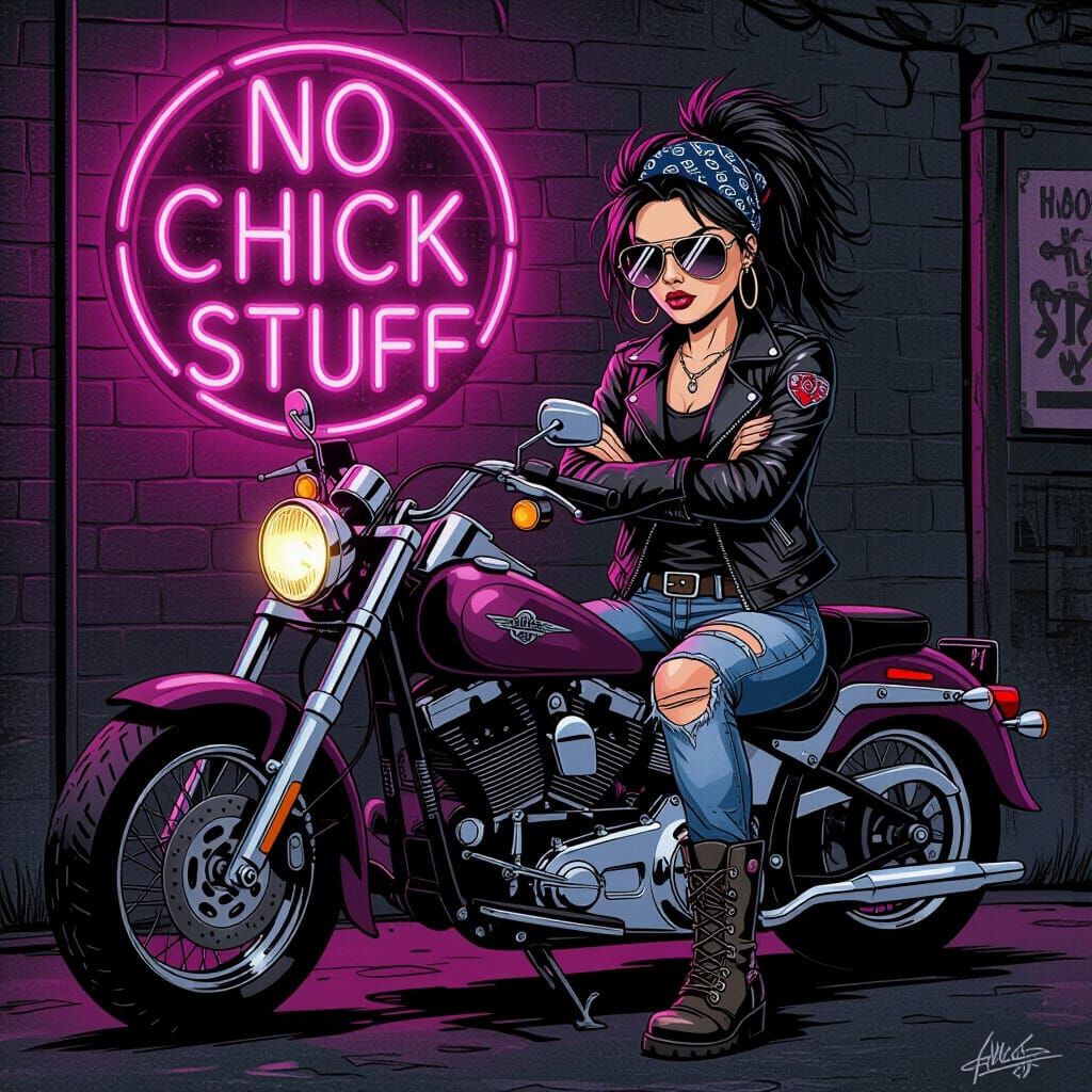 This image shows a biker chick sitting on a vintage motorcycle under a neon sign. The illustration is in a moody charcoal and gel ink style, with gritty shading and bright accents.