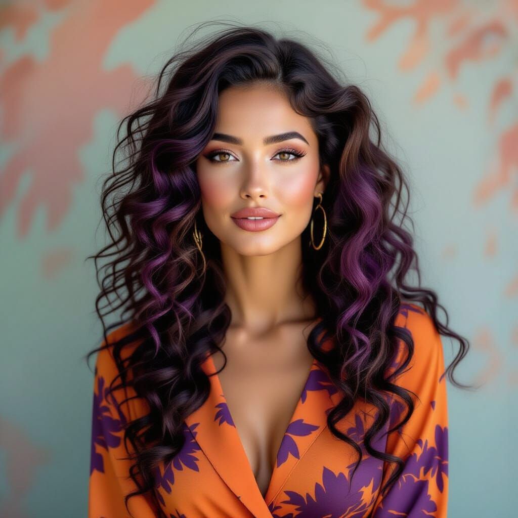 This image features a woman with striking long, curly hair in tangerine and aubergine hues, complemented by matching clothing. The background echoes the vibrant color palette.