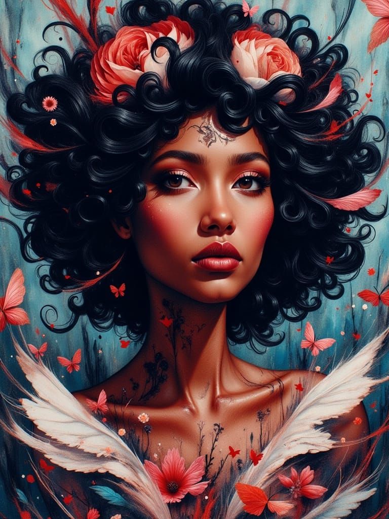A vibrant image of a Black-American woman with flowing afro hair emerging from a cocoon. Surreal fantasy elements, magical backgrounds, and dramatic lighting create a captivating scene in watercolor and woodblock print styles.