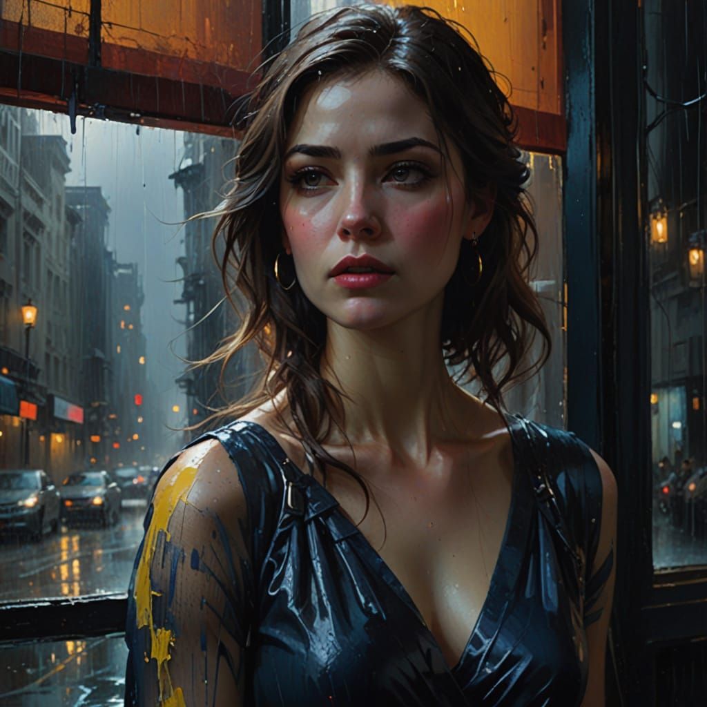 Generate stunning hyper-realistic oil paintings of women in navy dresses, by rain-stained windows, with our free AI generator.