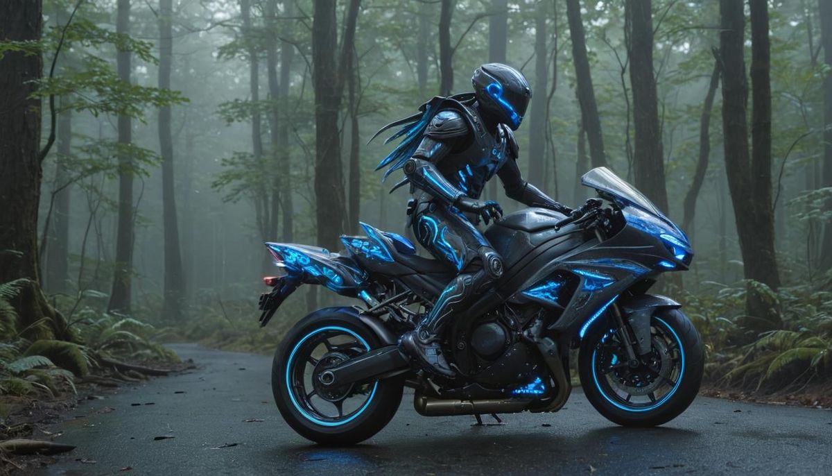 A striking picture of an alien biker knight in futuristic armor. The figure rides a bio-luminescent motorcycle through an iridescent forest on an alien world, in a biomechanical aesthetic.