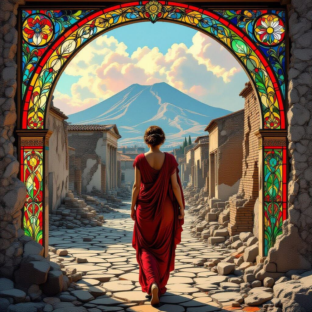 A vibrant stained glass image of a woman in ancient Pompeii during the city's destruction. Buildings crumble around her in this high-resolution 8K photo with intricate details in an art nouveau style.